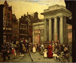 Zo heel anders is de Beurs van Zocher. Ook hier het foto-effect door de twee donkere pilaren aan weerszijden: de kijker wordt zo in het schilderij getrokken. Het bruist, je hoort het lawaai van de koetsen, je hoort de honden blaffen. Eén en al bewegelijkheid.