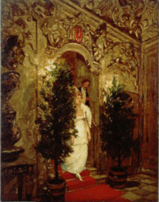 Die warmte zie je ook in 'De rode loper' waar een dame in avondtoilet de trap afloopt. Ook hier weer is het foto-effect weer aanwezig. Het is een harmonieus geheel en de aandacht op de dame wordt versterkt door de heer die vlak achter haar staat.