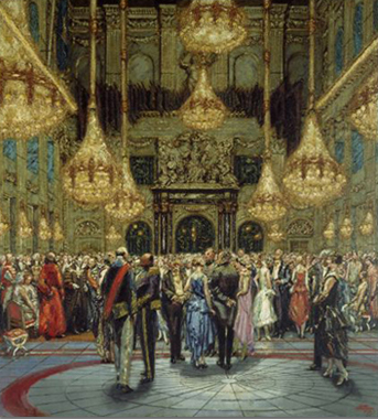 Het schilderij heeft ook iets geheimzinnigs: wat is het voor feest? De klok wijst het midder nachtelijk uur aan. Assepoester? Is het een paleis, een grachtenpand of een theater?